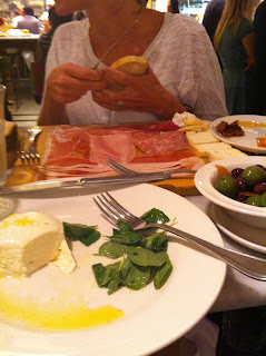 4. Friday, we went to the first meeting of a women's Bible study that Betsy's church started. It was a time of fellowship, singing, studying the Bible, and then breaking into small groups to pray. It was a very sweet time of prayer which left Betsy and me both in tears. (I love praying with other people. If you always pray alone you should try praying with someone else sometime. I can't explain the feeling except to say that you really feel the presence of God.) Afterwards we had lunch (Bouchon Bakery) with some of Betsy's friends, who I also claim as my own friends. Lots of fun catching up over delicious food. After a trip to Williams-Sonoma to drool over cooking supplies and taste the samples in the back (pumpkin bread with cream cheese icing) it was time to pick up Hattie from school. I spent an hour playing with all the girls before Lee came home and took them to Connecticut. (I was excited that it was a no kids weekend but it was sad to see them get on the elevator.) After walking around Chelsea, and visiting the High Line, we had dinner at an Italian place that Gwenyth Paltrow likes and that started my weekend of mozzarella, bread, and tomatoes.